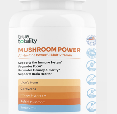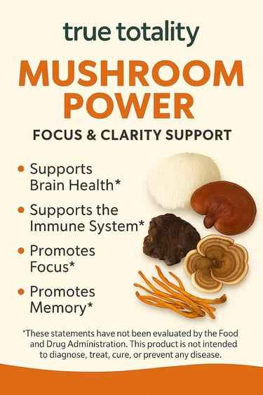 Premium Mushroom Complex for Daily Wellness Doctor-formulated blend of Lion’s Mane, Reishi, Cordyceps, Chaga & Turkey Tail designed to support focus, immune defense, energy, and stress balance.